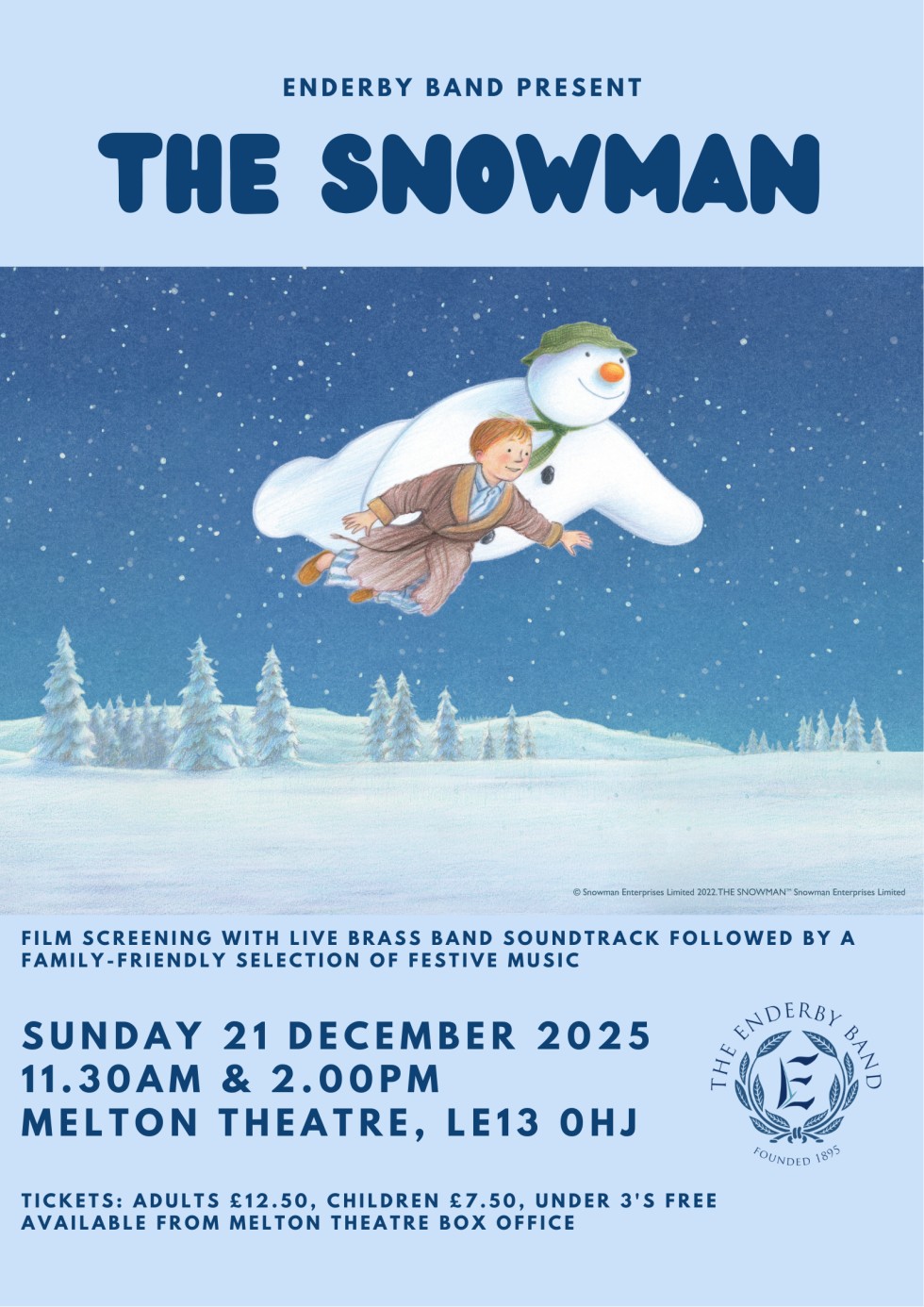 Following two years of successful performances across the county, Enderby Band are making a return visit to Melton Theatre this winter with two screenings of the Christmas classic, The Snowman, with live brass band soundtrack. The film will be followed by a short selection of family-friendly festive favourite pieces, songs, and carols to leave you with those cosy Christmas feelings on the run up to the Big Day.